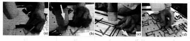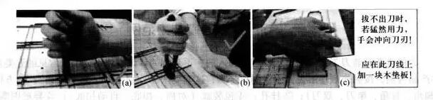 2、冲桥:经过反复撞刀、比刀,直到弯刀形状与已切割的缝隙形状吻合后。再在刀、线上打桥位的位置,应比对版上对应的桥位,选取能配合的桥位切口尺寸,选取桥位冲头配件。在刀、线上打桥位应按下图所示的握柄方式,打桥位,不应按图(b)的握柄方式。